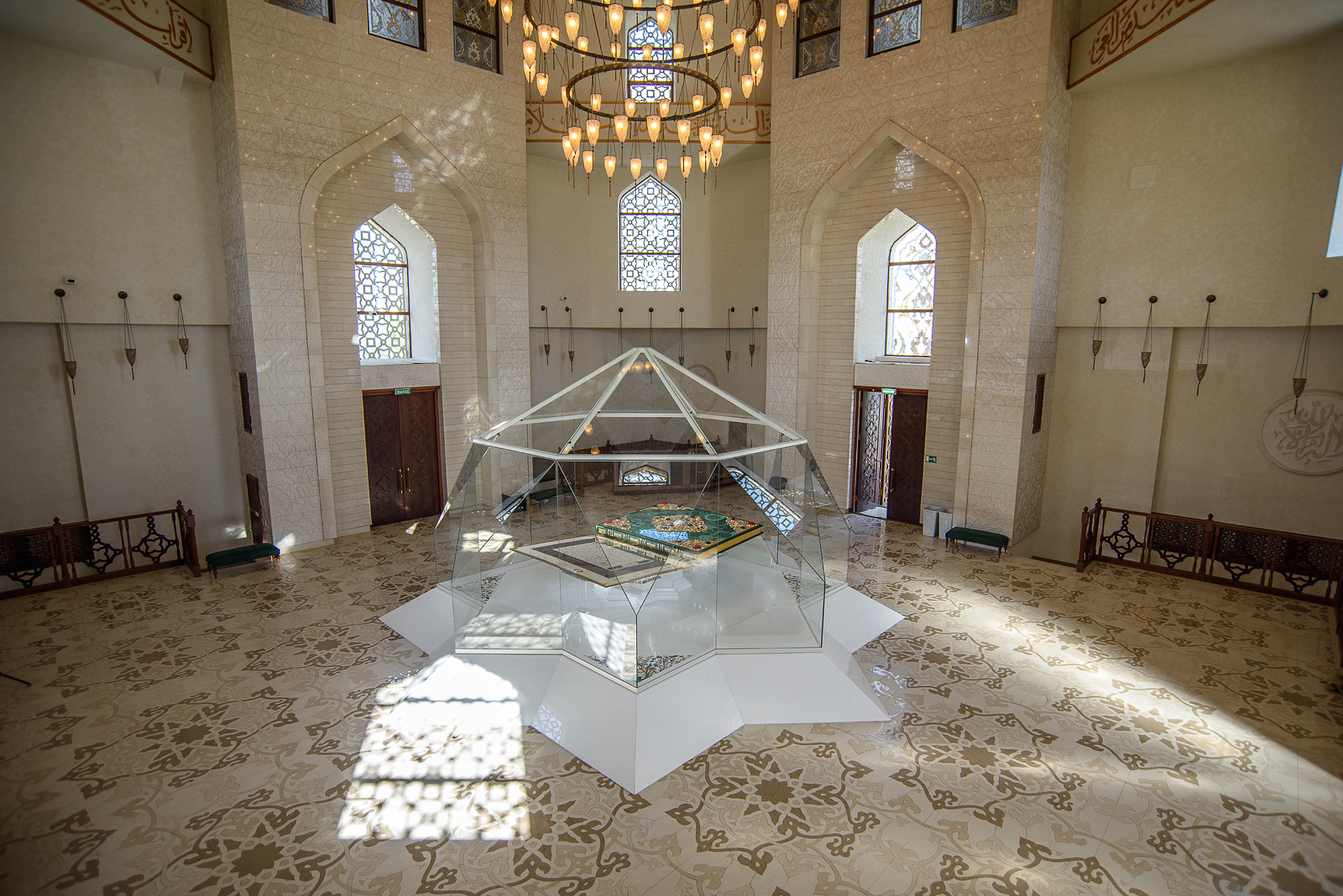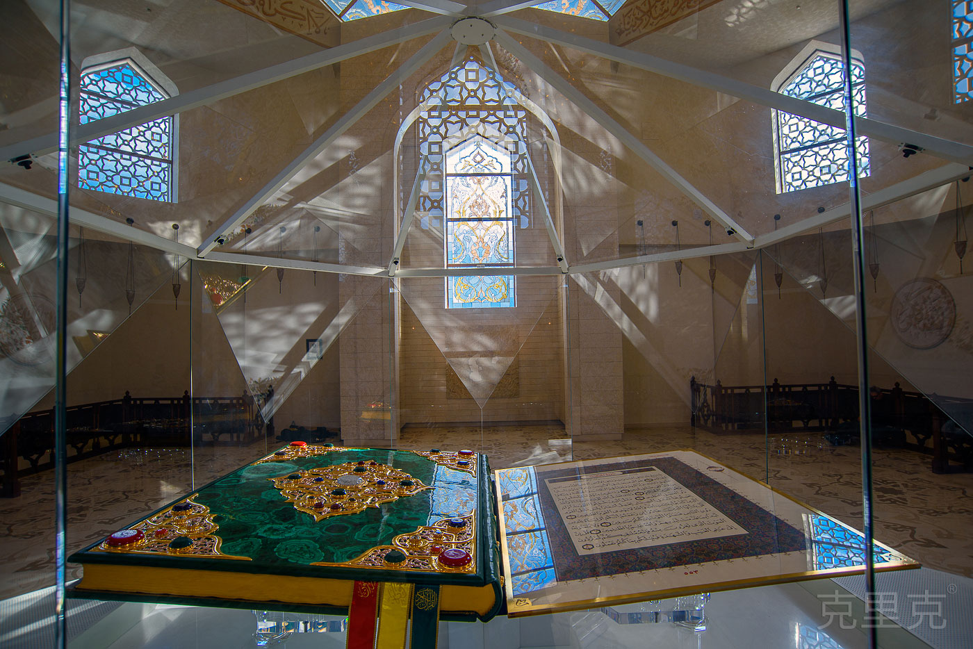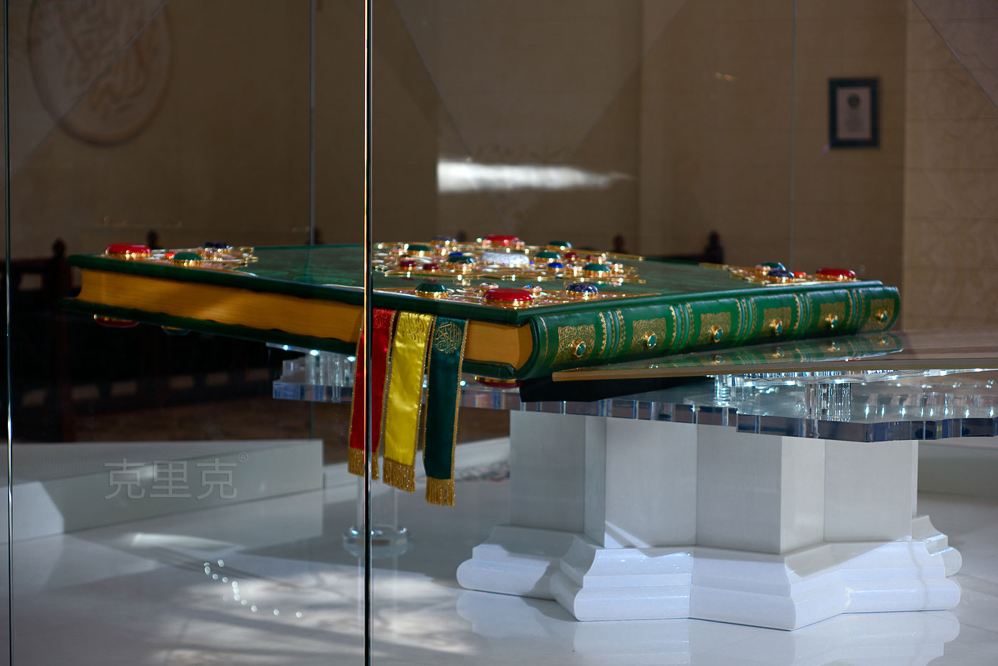 而存放這本世界最大古蘭經(jīng)的展柜由中國展陳設(shè)計師胡細(xì)斌設(shè)計,四川克里克展覽展示有限公司生產(chǎn)并施工安裝,以其獨特不可復(fù)制的造型及開啟方式和施工難度成為博爾加爾古蘭經(jīng)博物館最亮眼的景觀。