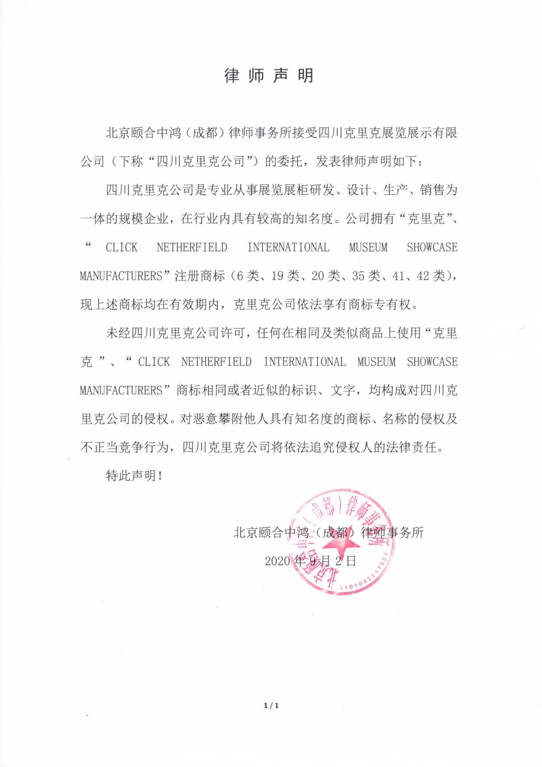 北京頤合中鴻(成都)律師事務所接受四川克里克展覽展示有限公司(下稱“四川克里克公司”)的委托,發(fā)表律師聲明如下: