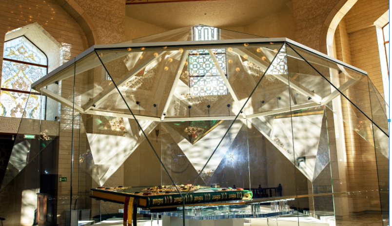 克里克設(shè)計(jì)并制作了一個(gè)獨(dú)特的水晶帳篷形狀的展示柜。該陳列柜于2018年3月安裝,以八字形狀的底座為基礎(chǔ)。底座被涂成白色,這是伊斯蘭文化中最受人喜愛(ài)的顏色,以展現(xiàn)一種純正和寧?kù)o的感覺(jué)。頂部的金屬梁也是如此。展示墻安裝沒(méi)有支柱。整個(gè)建筑僅由玻璃墻支撐,充分展示了我們的精確設(shè)計(jì)和精湛的施工技巧。陳列柜主要由玻璃制成,整體形象類似于一個(gè)巨大的水晶帳篷,與博物館的頭盔狀圓頂完美呼應(yīng)。