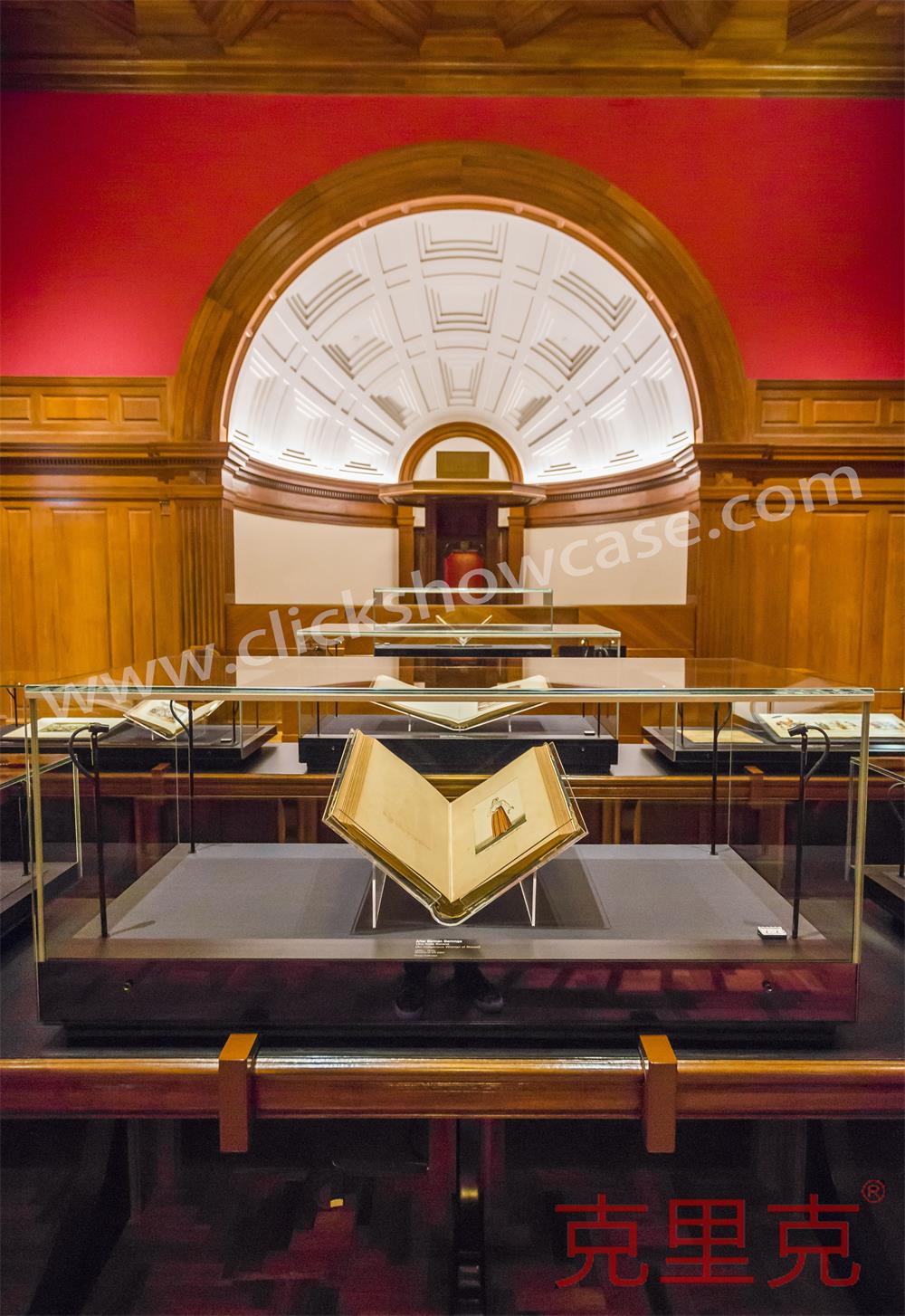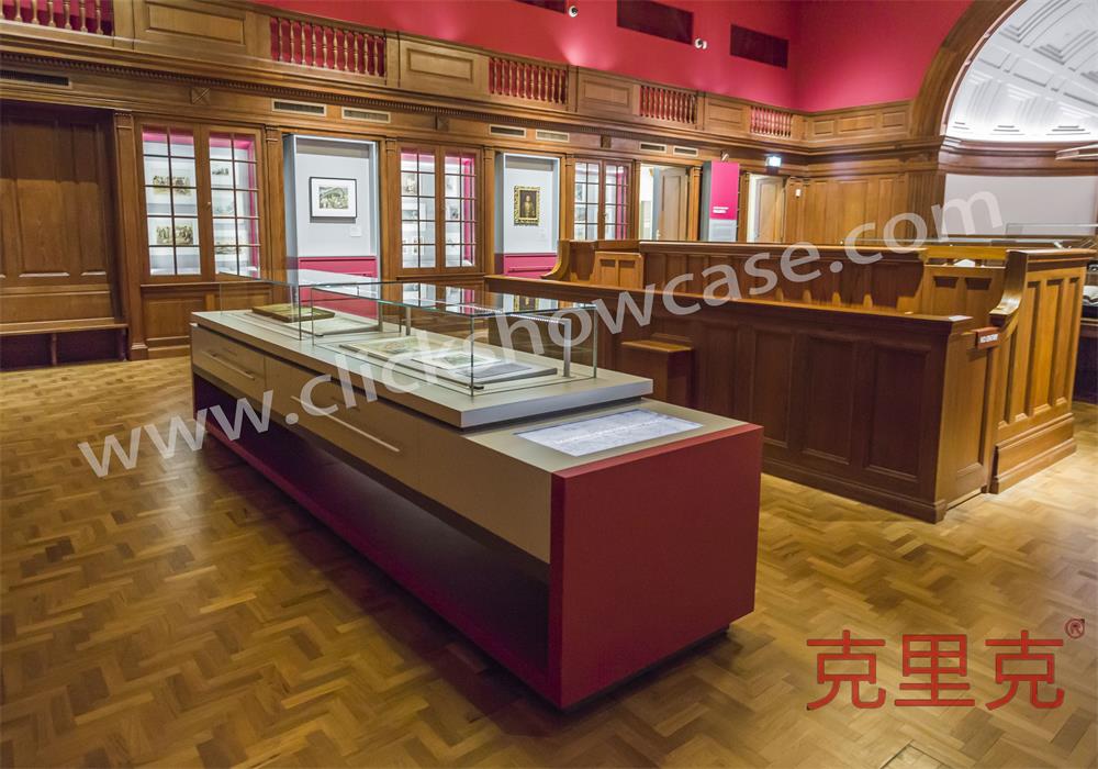 一件由四個獨立柜組成,長達近 5 米的特制展柜,使用了近 2.5 噸金屬,該組合展柜所有功能設備,包括光纖照明系統(tǒng)、半自動緩閉裝置、被動吸入式通風設施、電動開啟開關甚至一塊桌面觸控顯示屏幕都被巧妙的隱身在這個多層組合柜中。設計團隊甚至必須為用來放置展柜的桌子(具有歷史意義的桌子,同樣也是館藏文物)設計無接觸式的光纖照明系統(tǒng)。